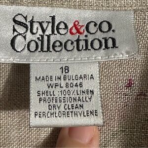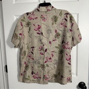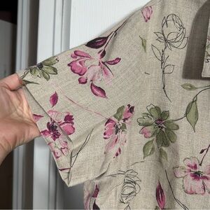 Size 18 Style & Co. 100% linen shirt. Beige background with pink and green floral pattern. Collar, button front, small side vents. Short sleeve, loose fit.