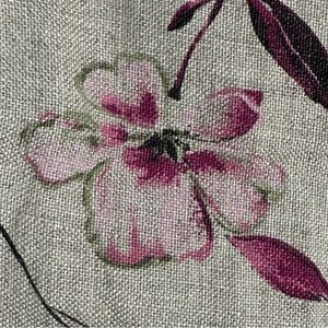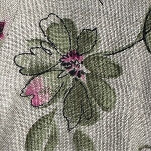 Size 18 Style & Co. 100% linen shirt. Beige background with pink and green floral pattern. Collar, button front, small side vents. Short sleeve, loose fit.