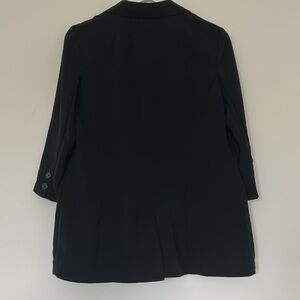 Loose fitting, professional blazer with two front pockets. Pockets still sewn shut, One button closure near the stomach. Cropped, wide sleeve with two buttons on each.