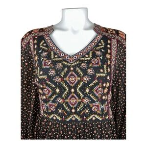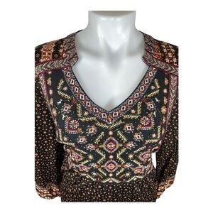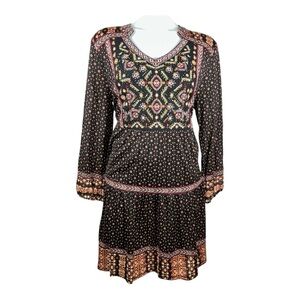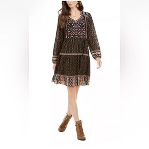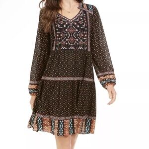 Style & Co Black Brown Boho Embroidered Beaded Floral Nylon Mesh Tiered Dress PL