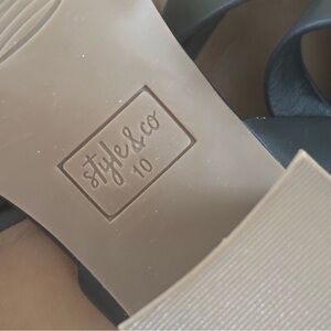 These elegant black sandals from Style & Co. feature a minimalist design with a block heel for added stability. The adjustable ankle strap and wide front strap ensure a secure fit, making them perfect for both casual and formal occasions.