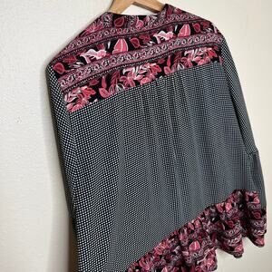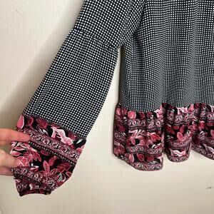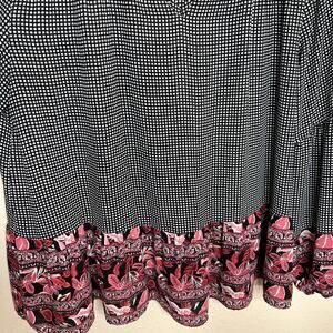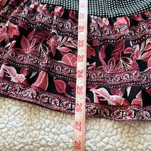 Style & Co Black Pink Floral Check Print Boho Blouse Large. Preowned and in great condition. Has floral print along chest, hem and sleeves. Middle is a black and white check pattern. Very cute for fall. Please see all photos. Approx measurements in pictures.
