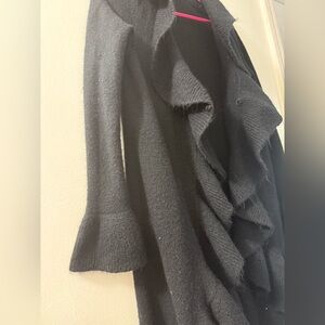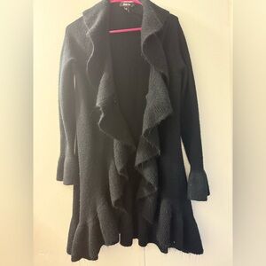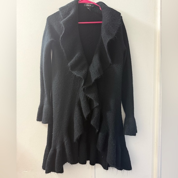 Soft knit open-front cardigan with tiered ruffle trim. Long sleeves with slight flared cuffs. Flowy hem for feminine silhouette. Easy to layer over tops or dresses.