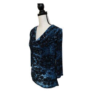 Beautiful top! 3/4 sleeves, cowl neck embedded sparkes in the fabric, not sequins. Blue on blue, resembles a beautiful night sky. Form fitting and stretchy, polyester and spandex.