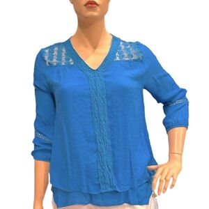 Style & Co Boho Lace Inset Shirt Size XL Turquoise/Aqua V-Neck, Layered Look Hem