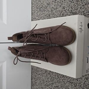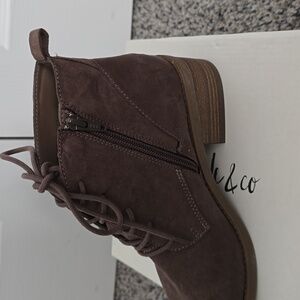 Size 7M. Lace up with tongue. Inner ankle side zip. Soft faux suede