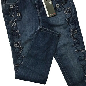 NWT. Ankle Jeans Women Size 4P. Dark wash, embroidered design front sides, 5 Pocket design, Zipper & button to close, mid-rise. Pictures part of description. Retails $59.50.