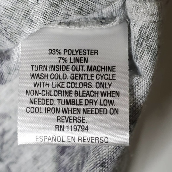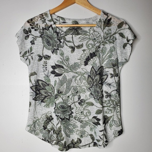 Features : heathered gray, green floral, round neck tee, extended shoulder, 93% polyester, 7% linen, casual, summer
