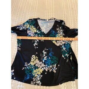 Style & Co Faux Wrap Blouse Size 1X Black Floral + Stretch 3/4 Sleeve V neck Top