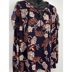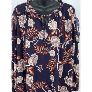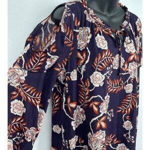 This womans blouse is from Style & Co. This blouse is navy blue with a red, white, and pink floral pattern. This top has long, cold shoulder sleeves with elastic arm hems, and a round, tie neckline. This blouse is in excellent pre-owned condition.
