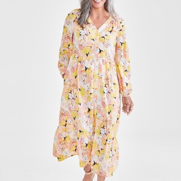Style & Co. Floral Print Long Sleeve Button-Front Midi Dress Petite Medium
