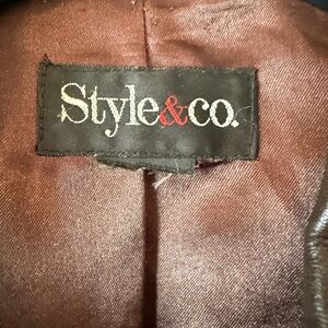 Style & Co. genuine brown leather jacket. Fully polyester lined. Side pockets also lined. Collar. Zip up. Longer fit. In great condition. Hardly worn.