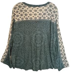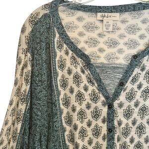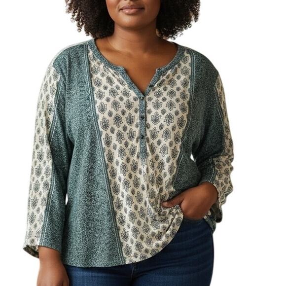 Style & Co Henley Top Womens Size 2X Teal Woodcut Mixed Print Boho Knit Tee
