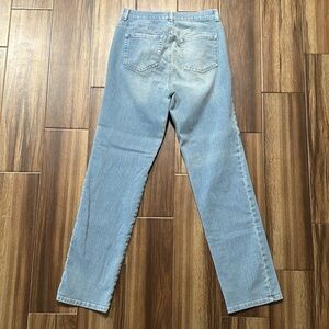 These jeans are in excellent preowned condition. Straight leg cut with high waist. They have some stretch. Please see photos for further details and measurements.