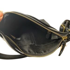 Antique brass exterior hardware, back snap pocket & front zip pocket; interior phone pocket & back wall zip pocket