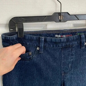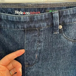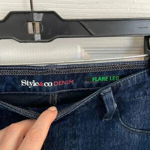 Dark denim (97% cotton) with 3% spandex jeggings. Faux front pockets and no zipper/button closure. Real back pockets. Gorgeous Y2K flare jeans!! Great condition.