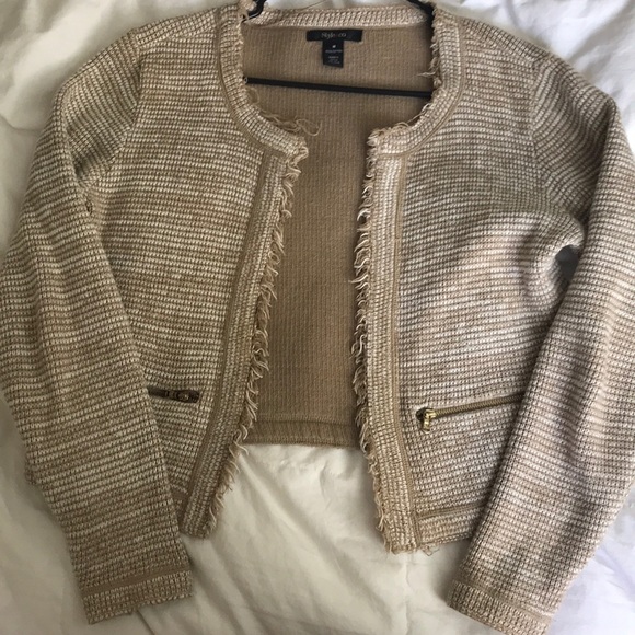 White/beige sweater like jacket. Longer in front. Super cute on. Doesn’t fit anymore.