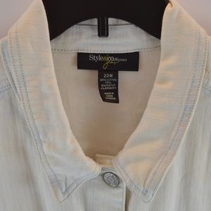 NWT Style & Company Woman Jeans White Washed Jean Vest Jacket. Button up with pockets and collar. 84% Cotton, 15% Polyester, 1% Spandex. Size 22W White Acid Wash Style 61633AW181