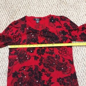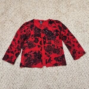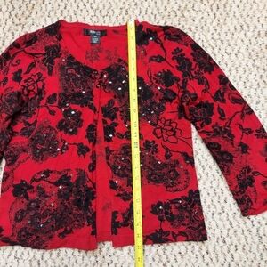Red cardigan with black floral pattern and sequin accents. Just two buttons at the top, not all the way down (by design). Petite medium, measurements pictured.
