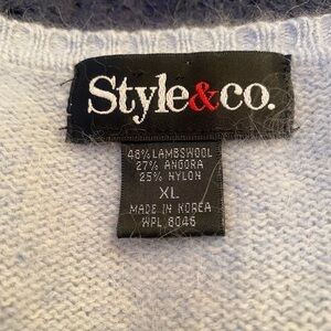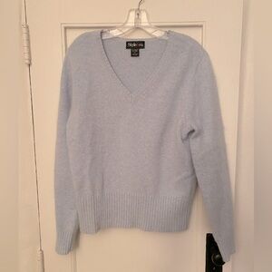 Style & Co. lambswool Angora a Blend V-neck sweater in a soft pale blue. A sweater is marked XL but I think it fits more like a medium so that’s how I’m listing it but please see measurements. It’s in good preowned condition with a little bit of pilling.