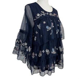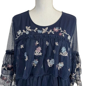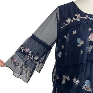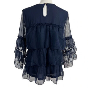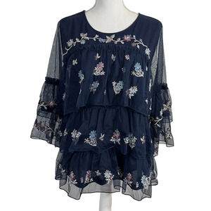 Style & Co Layered Ruffled Flower Embroidered Blouse Large Sheer Mesh Overlay