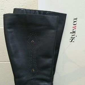 EUC. Black leather Style & Co. studded boots, 3 1/2 inch heel, 16 inch shaft, like new.