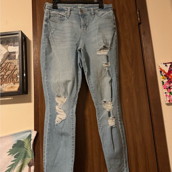 Trendy light blue skinny jeans with stylish rips. Perfect for casual outings. Comfortable fit.