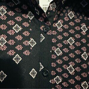 This piece blends Modern Artwear and Techno Boho flair with a touch of Y2K Revival edge. The abstract print and geometric patterns channel Indie Sleaze, Art Teacher Chic, and Urban Creativecore, while the structured button-down silhouette adds a nod to Office Siren, Minimalist Retro, and 90s Aesthetic.