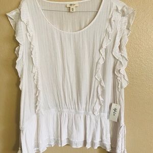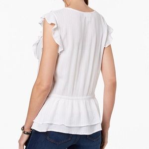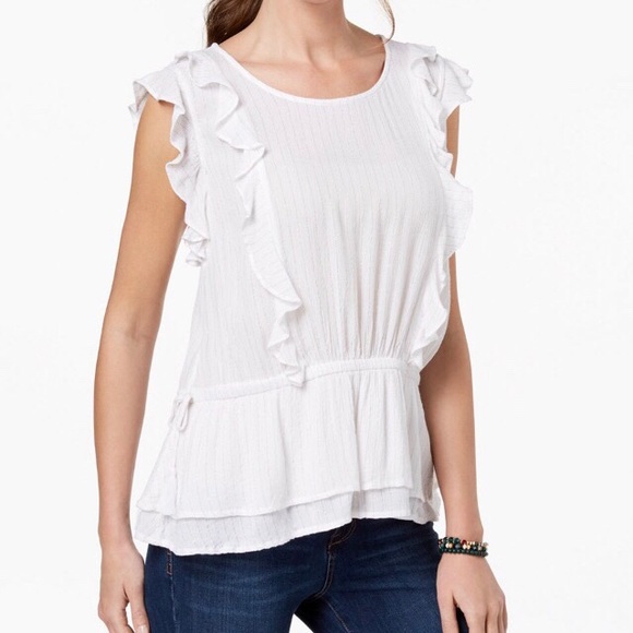 A flouncy hem and pleasant ruffles make this top a darling addition to your casual collection. Metallic threading add a touch of glimmer.
