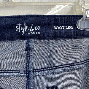 Elevate your denim game with these Style & Co mid-rise boot leg jeans in a beautiful shade of blue. These jeans feature a 5-pocket design with a zip and button closure, and are made of a comfortable and stretchy polyester, cotton, and elastane blend denim fabric. The high-rise waist and tummy control make them perfect for any season, while the 4-inch inseam and easy care instructions make them a practical addition to your wardrobe. The stylish accents, such as the button and zipper details, add a touch of sophistication to these jeans. They are perfect for outdoor activities or a day at the beach. These jeans are part of the Style & Co Jeans product line and are made in Jordan. Available in size 16WP, these jeans are a must-have for any fashion-forward woman.