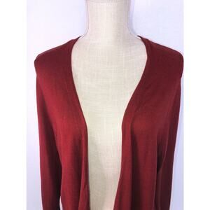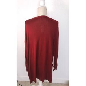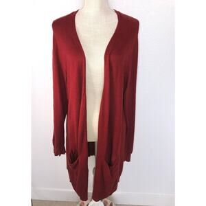 Style & Co Open-Front Duster Cardigan in Merlot - 3X This versatile cardigan is perfect for layering in the seasons. It features front pockets and an open neckline. The hems and cuffs are ribbed. It is a relaxed fit that hits mid-thigh. New with tags, No rips, stains, or damage. Fabric: 65% Rayon, 35% Nylon Pit to Pit: 21in Shoulder-to-hem: 33in (approximate- all measurements are taken straight across the garment lying flat) #Duster #Cardigan #OpenFront #OpenFrontCardigan #Merlot #Layering #Transitional #BusinessCasual