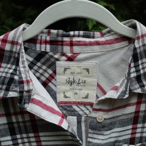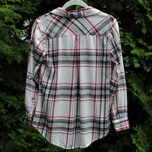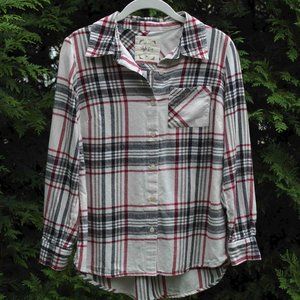 Style & Co petite cream/black/maroon/tan flannel hi-lo button-front top with rounded hem & back yoke with box dart