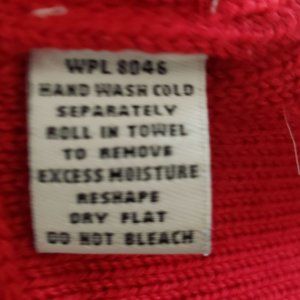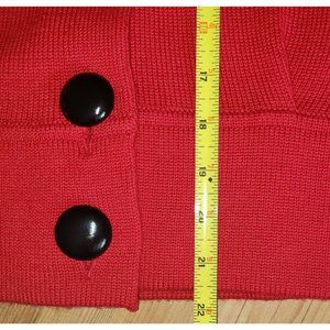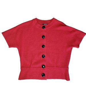 Bright red short sleeved button up sweater. Size is small, but look at the measurements to make sure it fits. It is waist length, with big black buttons.