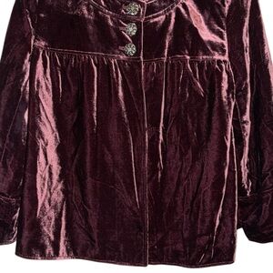 This elegant burgundy jacket from Style & Co. showcases a modern boxy silhouette with a chic mandarin collar and 3/4 sleeves. The buttoned design adds a sophisticated touch, making it a versatile piece for any occasion.