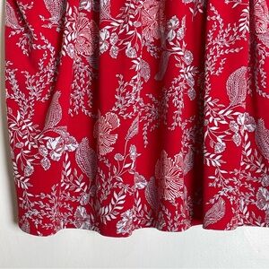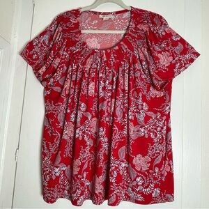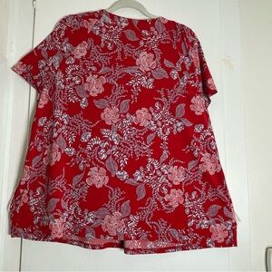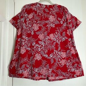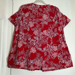 The Style & Co Red Pleated Blouse is a relaxed and elegant top featuring a vibrant red hue with delicate white and blue floral accents. 3XL. Its pleated neckline adds a touch of sophistication, while the soft, flowing fabric ensures comfort and style. Perfect for both casual and dressy occasions, this blouse is a versatile addition to any wardrobe. Great preowned condition.
