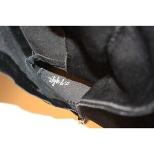 Elevate your footwear collection with the Style & Co. Women's Kimball Over-the-Knee Riding Boots. Crafted from a mix of manmade and textile materials, these boots feature a sleek black color that pairs effortlessly with any outfit. The stretch-calf design ensures a comfortable fit, while the faux suede outsole and suede lining offer lasting comfort and durability. The boots boast a stylish block heel with a low height for everyday wearability, and the overall design is finished with a classic equestrian and preppy theme. Ideal for winter seasons, these boots are available in a US size 9.5 with a medium shoe width and a shaft style that sits over the knee. The Kimball boots are a versatile addition to your wardrobe, seamlessly blending elegance and practicality. Good Pre-Owned Condition.