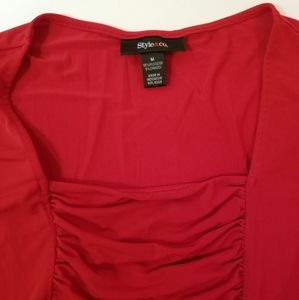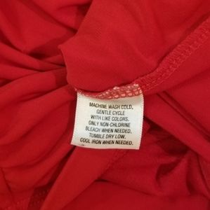 Cherry 🍒 red color. Sleeveless with a flattering ruching detail down the front. Lots of stretch. 95% Polyester 5% Spandex. Cute under a black blazer.