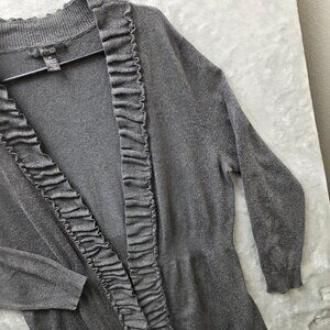 Key Features: Ruffled trim, open front, lightweight knit, long sleeves