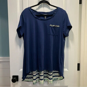 Style & Co Navy Short Sleeved Tee with Pleated Silky Coordinating Fabric Back. Size 2X.