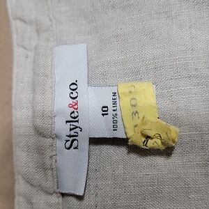 Style & Co Size 10 Oatmeal Colored 100% Linen Studded Neckline Short Sleeve Top.  Gently Used Condition, No Holes, Rips, Stains or Snags.  Adorable and Comfy Linen Top with Round Neckline adorned with Dark Brown Metal Studs.   Henley Style Button Front with Matching Buttons.  Single Chest Pocket.  Elastic/Smocked Waistband.  Great Everyday Top!  Please refer to measurements in photos to ensure proper fit.  Shown on size 4-6 mannequin.