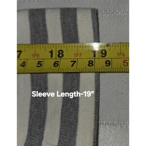 Previously Owned Womens Striped Top. Gray and white horizontal stripes with a gray design on front. Pullover to wear. This is by Style & Co Sport and it is called THE ESSENTIAL SWEATSHIRT, but this doesn't seem like a sweatshirt to me, its a pullover top.