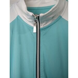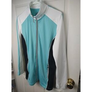 Style Co sport women's black white aqua colorblock track jacket in good condition. Front zip close pockets. Straight hemline front zip close long sleeve.