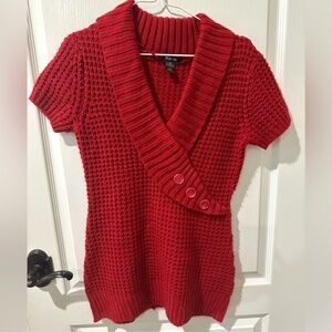 Red v-neck faux wrap short sleeve sweater top by Style & Co. Faux Wrap accompanied by 3 chunky buttons. Chunky 100% acrylic knit. Tunic length. Could also be short mini dress for that shorter torso.