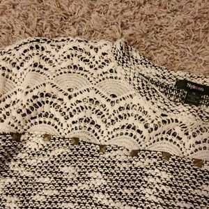 Beautiful black and cream colored. See through lace at collarbone with metal accents. Excellent condition. Only worn once. XL.