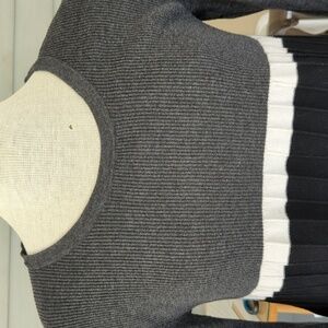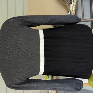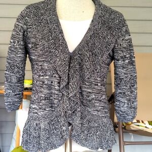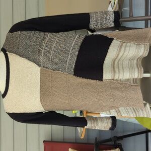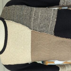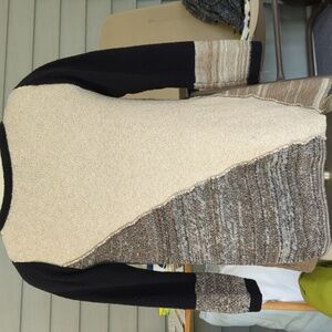 bundle of 3 petite large sweaters, in neutral colors, including tan, beige, cream, grey, black and white. crew neck, scoop neck and v- neck style, with ruffled collar, and handkerchief hemline. long sleeves or 3/4 length sleeves . cotton and or cotton/ acrylic/ nylon blends, all great condition!!
