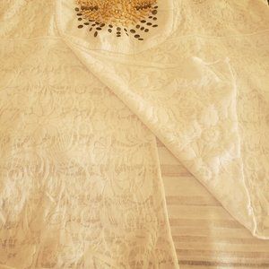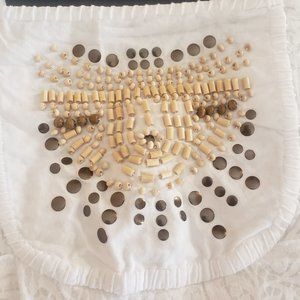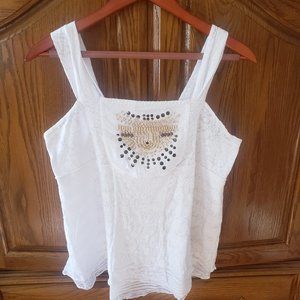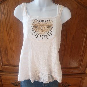 This pretty Style and Co. top is 54%cotton and 46% polyester. It is a size large in off white color. It has a beautiful bead design on the front and the bottom has two layers. The back has an elastic stretch for comfort. It is used in good condition.