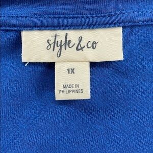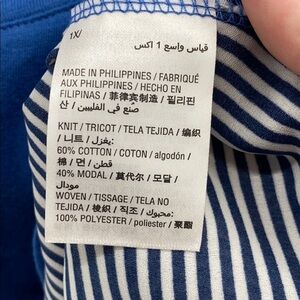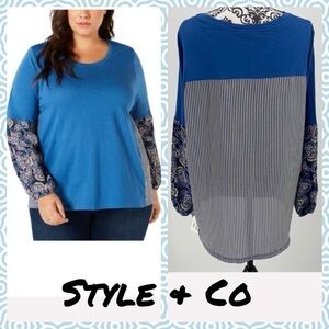 Style & co brand. Bright blue at front bodice . Back has semi sheer navy and white striped print. Bottom half of sleeves have floral paisley print. Banded bottom of sleeves. Knit: 60% cotton 40% modal. Woven: 100% polyester.