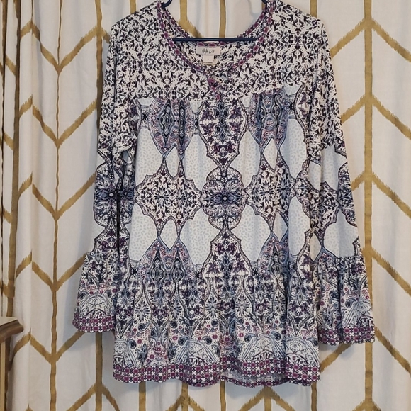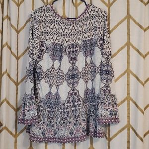 Patterned purple, white and blue tunic with peplum bottom and flared sleeves. Cute lattice design at the upper cleavage.