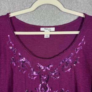 Style & Co Tunic Top 1X Purple Sequin Embellished Soft Thin Artsy Stretch Jersey Shirt Womens 3/4 Sleeve Scoop Neck