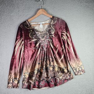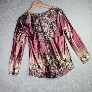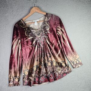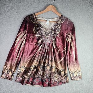 Feel expressive and stylish every time you wear this plush velvet boho tunic by Style & Co. The deep burgundy hue, artistic gold and taupe prints provide instant personality and artisan flair. Dress it up with skinnies and knee-high boots, or wear casually over leggings—the relaxed pullover fit is both comfortable and flattering. The baroque-inspired metallic detailing makes it a standout choice for fall or festival looks, while the high-quality fabric feels soft against your skin. No visible flaws—colors and design are vibrant, ready for a new home!